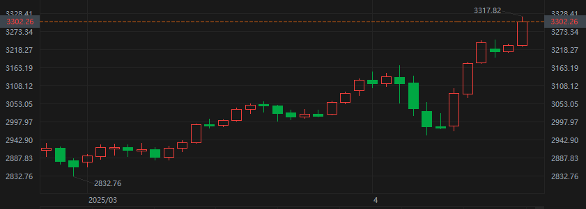 北京时间周三(4月16日)16:00附近,正好是刚进入美股盘前时段,现货黄金价格升破每盎司3300美元,并于16:18左右达到日内高点每盎司3317.82美元。