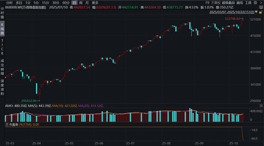 注:万得微盘股指数近期连创历史新高(截至10月22日收盘)