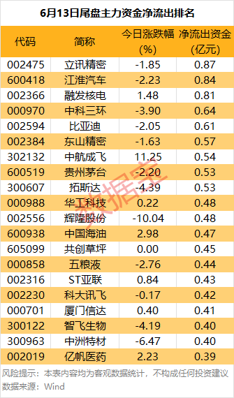 其中,立讯精密尾盘主力资金净流出居首,达0.87亿元。