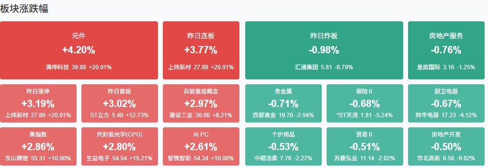 板块方面,CPO、PCB、PEEK材料、华为海思等板块涨幅居前,保险、房地产、电力、燃气等板块跌幅居前。截至收盘,沪指涨0.09%,深成指涨0.87%,创业板指涨1.13%。