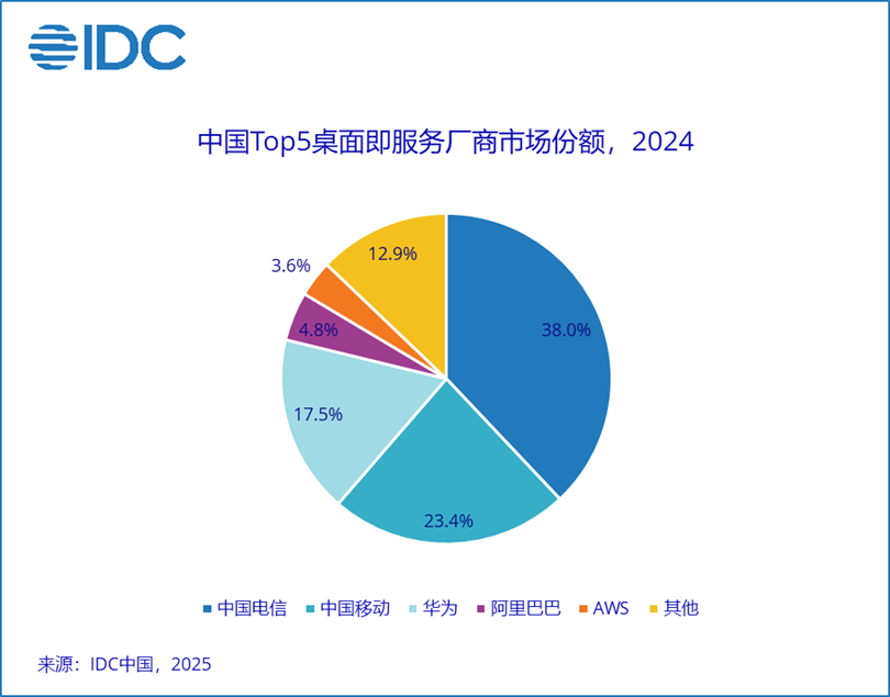2024年中国桌面即服务(DaaS)市场规模为7.25亿美元,前三大供应商市场份额合计高达近80%,竞争格局相对集中。运营商依靠云网融合优势、边缘节点部署能力和渠道优势,更易触达政企、公共部门、家庭以及个人用户;云服务商则凭借丰富的云生态与用户基础,在高端制造、3D设计、游戏渲染领域形成差异化竞争力。本土头部厂商持续推新优化,如中国电信聚焦安全防护与协同办公,中国移动适配国产芯片并提升智慧化体验,华为聚焦智能运维与边缘云桌面方案,阿里巴巴则强化云生态与应用整合能力,AWS推出多用户共享云桌面资源池的功能等。