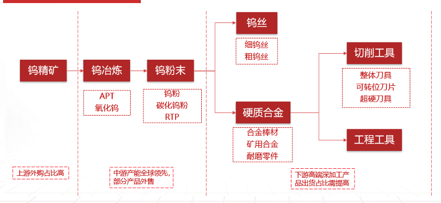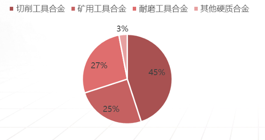 钨精矿产业链:上游钨矿的开采加工得到粗的钨精矿,中游钨精矿进行冶炼加工得到仲钨酸铵(APT)中间品,下游被加工过成下游需要的产品。约72%钨以合金形式消费,包括硬质合金及钨特钢,钨材占比23%,钨化工品占比4%。钨粉通过与其他金属粉末混合经过压制、烧结等工艺制成硬质合金,下游用于切削工具、耐磨工具、矿用工具等。