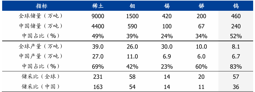 多国将钨金属纳入关键矿产清单。钨在地壳中的含量为0.001%,全球静态储采比为57年,中国储采比36年;全球钨资源情况与钼金属接近,但国内资源消耗程度显著高于钼。