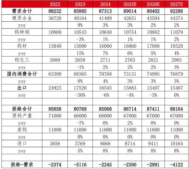 钨是一种稀有的国家重要战略资源,“工业的牙齿”。由于钨的稀缺性和不可替代性,目前被世界各国列为重要战略金属,被誉为“高端制造的脊梁“。我国的钨资源丰富,钨储量及矿山钨产量世界第一,根据USGS,2024年全球钨矿储量440万吨,中国240万吨(55%)、澳大利亚57万吨(13%),俄罗斯40万吨(9%)。根据机构测算模型,预期2025-2027年,如果我们国家依旧保持较高的限制,钨金属依旧保持2000-4000吨的供给缺口。