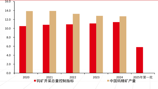 2025年第一批钨矿开采指标全面收紧。2025年第一批钨矿采总量控制指标为58000标吨,较2024年度第一批指标减少4000吨,降幅6.45%,其中主产区江西、云南、广东、广西等省份同比变动-2370吨、-400吨、-266吨、-240吨,低产区湖北、安徽、浙江、黑龙江2025年第一批钨矿开采指标归零,钨矿供给全面收紧。