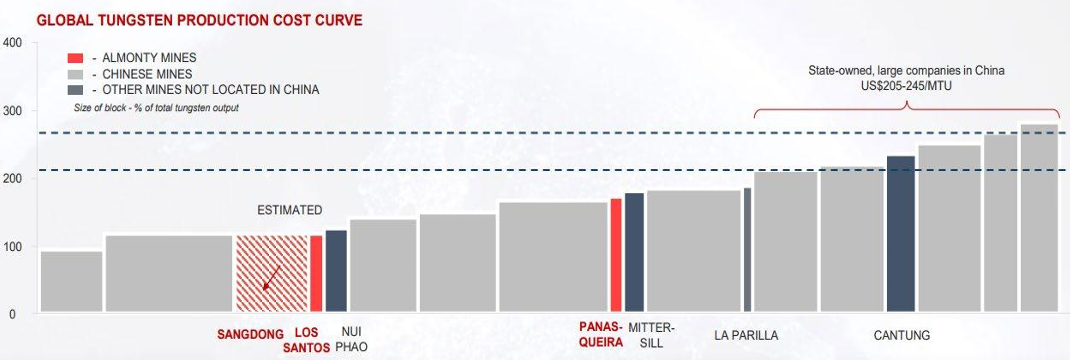 据中国钨协统计,我国钨矿山处理原矿平均品位由2004年的0.42%下降到现阶段的0.28%,如果按平均选矿回收率80%计算,则生产一个标吨的钨精矿需开采345吨原矿。根据Almonty数据,中国大型公司的钨矿成本为205-245美元/MTU,处于成本曲线的右端。
