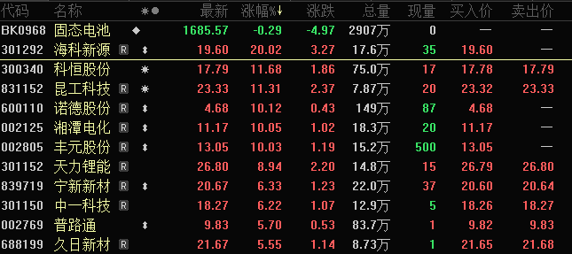 今天(6月19日)早盘,固态电池板块逆市上涨,海科新源“20cm”涨停,丰元股份、诺德股份、湘潭电化等个股涨停。