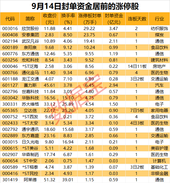 以封单金额计算,5股封单金额在1亿元以上,欣贺股份、赛力斯、武汉凡谷封单资金居前,分别为3.47亿元、2.94亿元、2.11亿元。