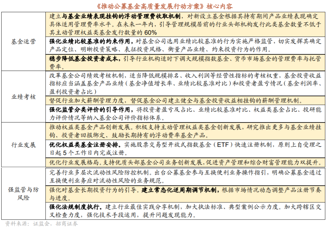事件:公募改革方案出台,行业迎来重大改革。5月7日证监会发布《推动公募基金高质量发展行动方案》,提出建立健全基金公司收入报酬与投资者回报绑定机制,建立与基金业绩表现挂钩的浮动管理费收取机制强化业绩比较基准的约束作用等,旨在通过系统性制度重构,优化基金运营模式,推动公募基金行业从“规模驱动”向“回报导向”转变,促进公募基金行业高质量发展。