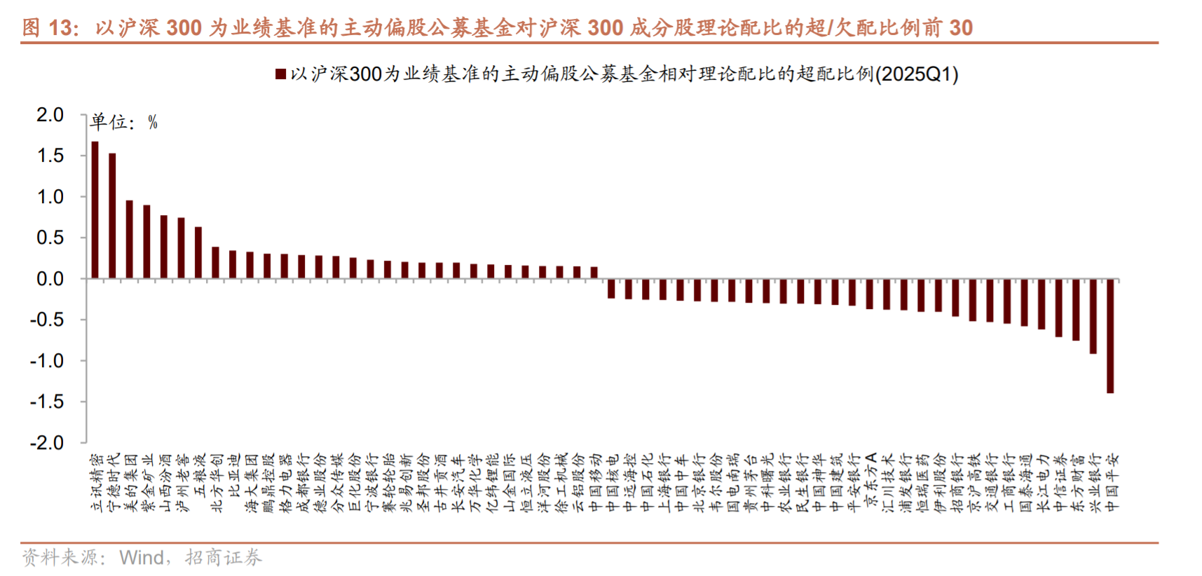 个股方面,目前主动偏股公募基金对个股的配比相对沪深300指数的超配前30和低配前30如下。