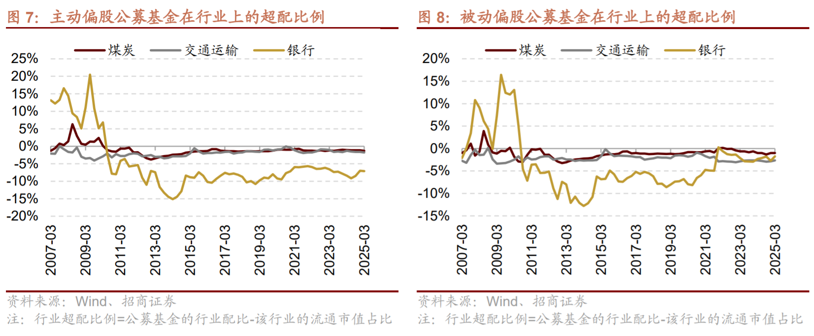 公募基金对高分红行业尤其银行长期处于低配状态,不过被动基金正在缩小这一差距,未来随着公募基金更加重视收益稳定性,对银行的低配比例可能进一步收窄。2010年以来,主动偏股公募基金对银行、煤炭、交运等高分红行业基本处于低配状态,尤其银行低配比例长期超过5%,到2025年一季度低配7.1%。相比之下,被动偏股公募基金在这些行业也相对低配,不过低配幅度比主动偏股公募基金相对小一些,2025Q1被动偏股公募基金在银行的低配比例为1.7%。