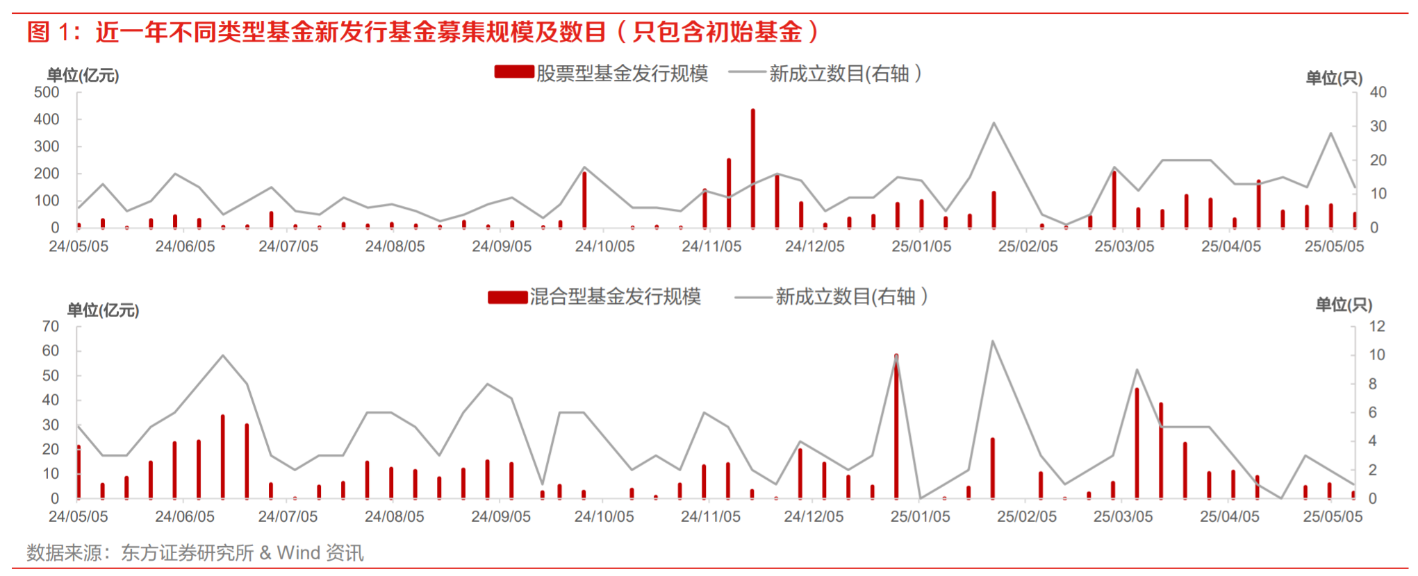 今年公募新发产品规模破3400亿:截至5月8日,2025年以来公募基金新发产品规模突破3400亿元,权益类基金规模为1837.53亿元,占比超过50%。而2022年至2024年,权益类基金发行规模在全年总发行规模的占比分别为28.3%、26.89%和28.01%,均未超过30%。从机构维度看,今年已有99家公募机构成立新基金。富国基金以143.23亿元的权益类发行规模居首,华夏基金和易方达基金紧随其后,分别发行了101.11亿元和99.89亿元;南方基金、招商基金、鹏华基金、天弘基金、建信基金、汇添富基金等的权益类基金发行规模均超过50亿元。