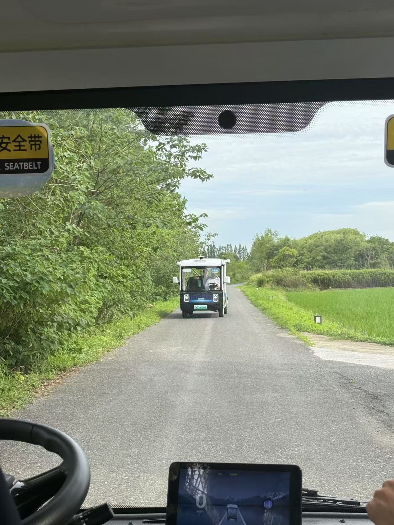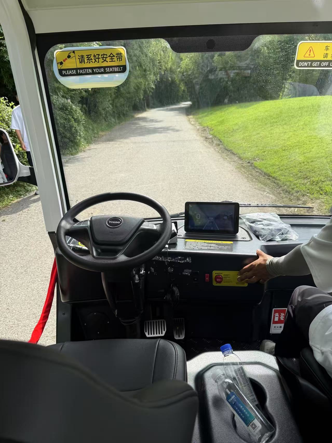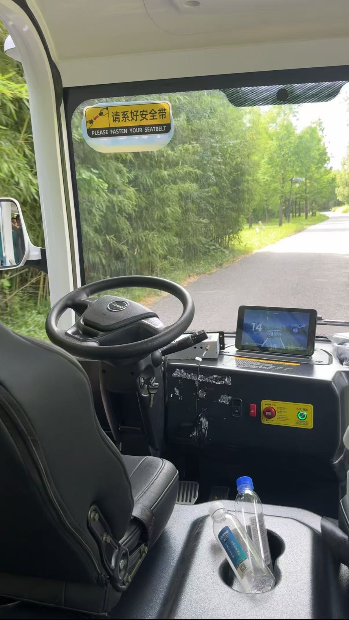 5排14座、手机APP自动操控、遇弯道转弯、见障碍物自动刹车停止......在浙江桐乡百翠山居的一条小道上,一辆观光车正在平稳运行,但是这辆的主驾驶座位上,没有驾驶员,副驾上配备了一位安全员。