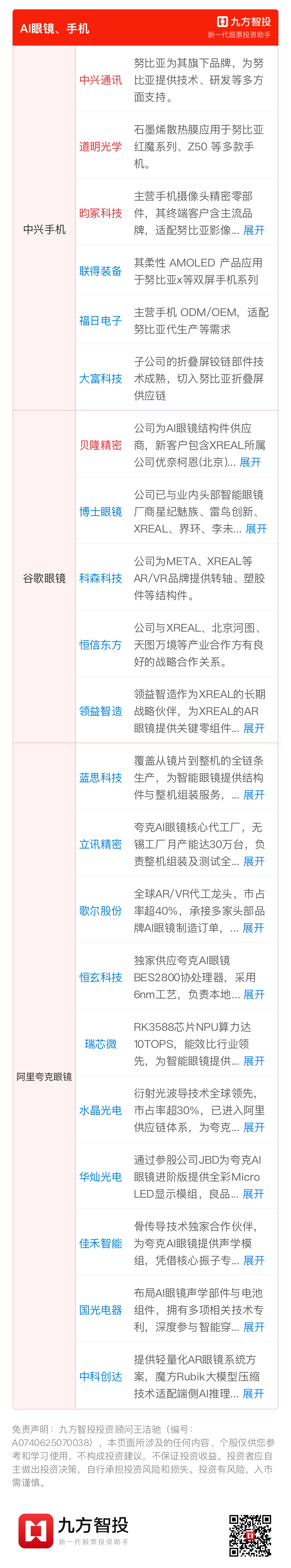 银河证券表示,上周消费电子板块反弹,受益于最新消费政策利好刺激,以及华为、影石创新、阿里夸克AI眼镜发布等事件催化。该券商认为,消费电子板块经调整后已有性价比,手机推荐关注苹果链和华为链,消费电子新品建议关注AI眼镜、全景无人机等新品类投资机会。
