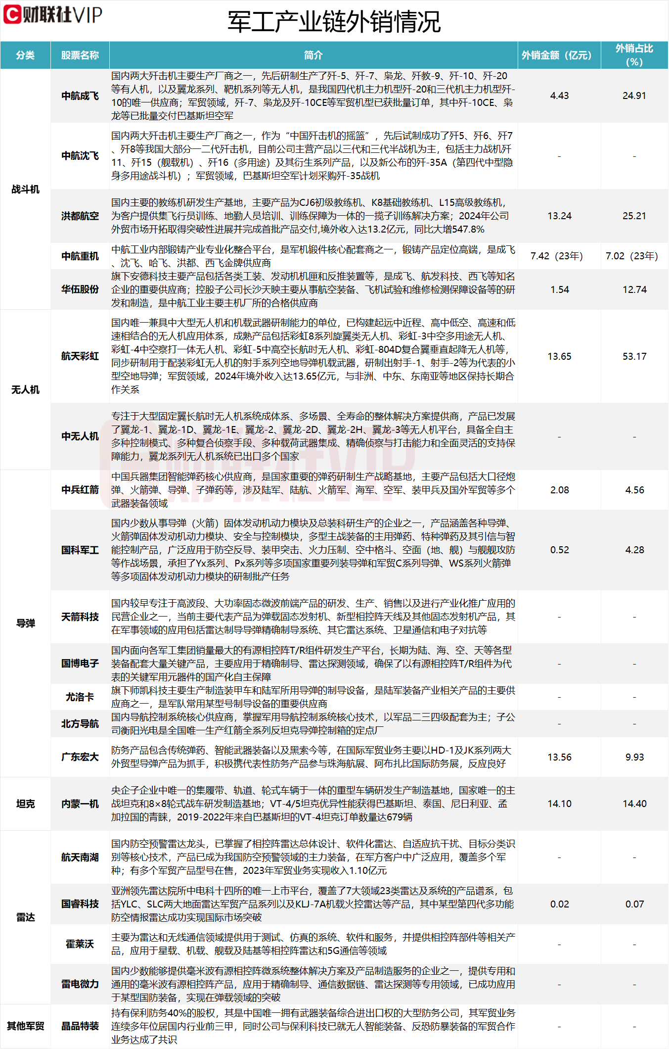 据财联社VIP盘中宝•数据栏目梳理的军工产业链外销情况,在战斗机、无人机、导弹、坦克等分类中,中航成飞、洪都航空、中航重机、航天彩虹、广东宏大、内蒙一机等A股上市公司外销金额超4亿元。具体情况见下图: