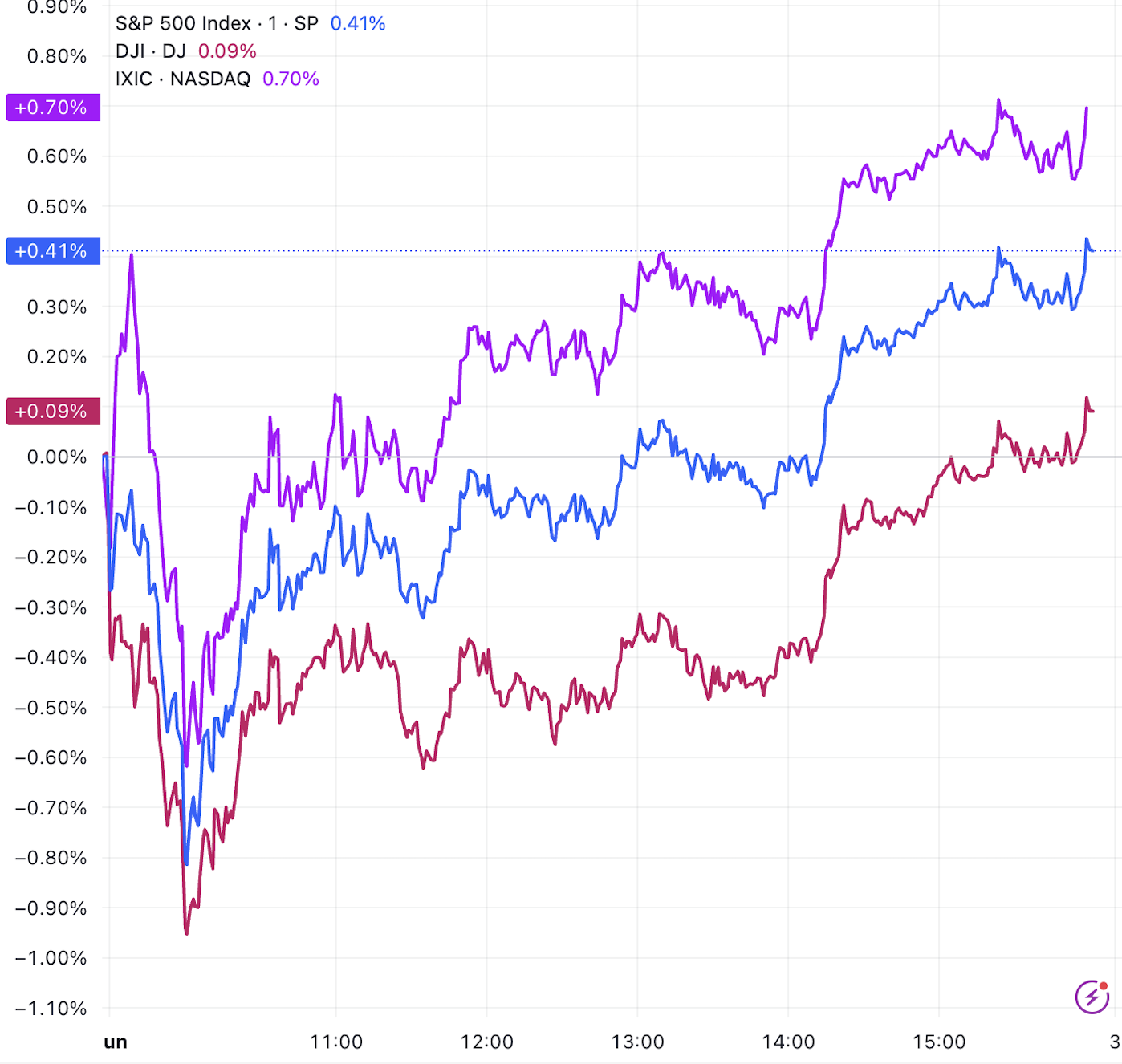 截至收盘,道琼斯指数涨0.08%,报42,305.48点;标普500指数涨0.41%,报5,935.94点;纳斯达克指数涨0.67%,报19,242.61点。