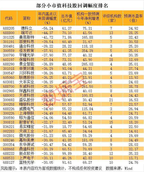 筛选出超跌小盘优质科技股,条件包括年内高点以来回调幅度超30%、评级机构数在3家及以上、市值低于百亿元、机构一致预测今年净利增速超30%且预测市盈率低于40倍的个股,合计有31只。
