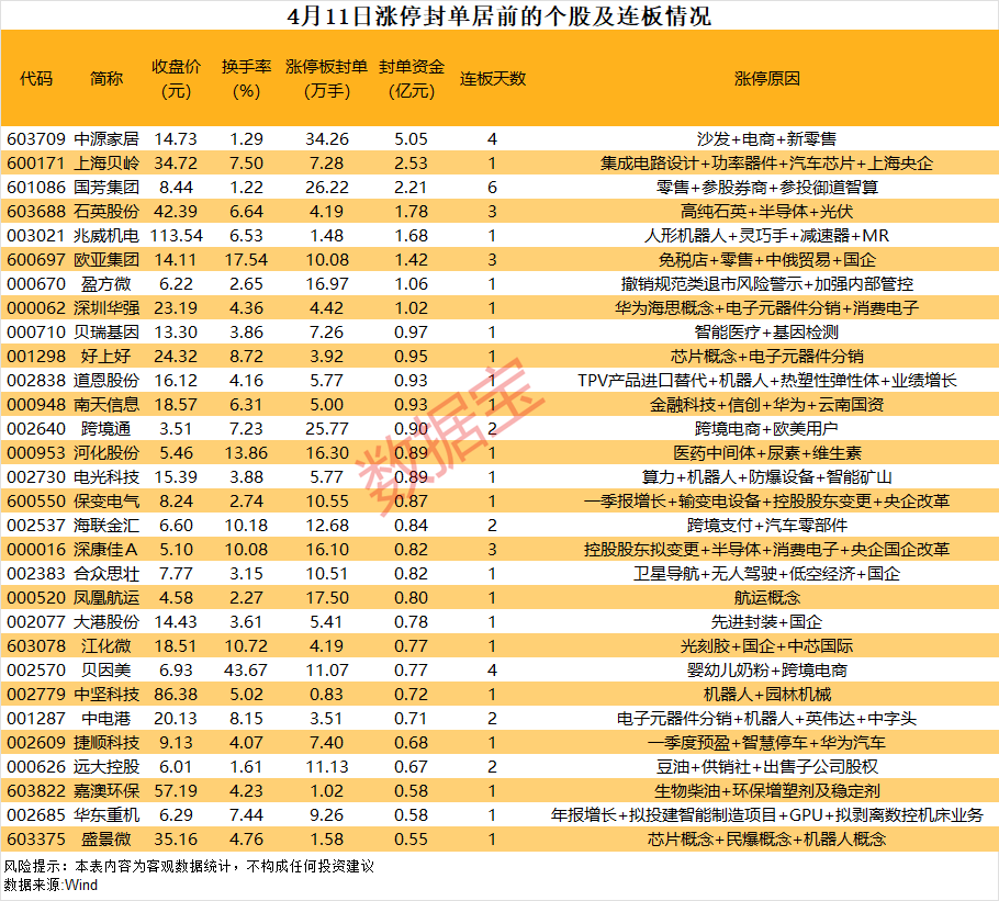 以封单金额计算,8股封单金额超亿元,中源家居、上海贝岭、国芳集团等涨停板封单资金最多,分别有5.05亿元、2.53亿元、2.21亿元。