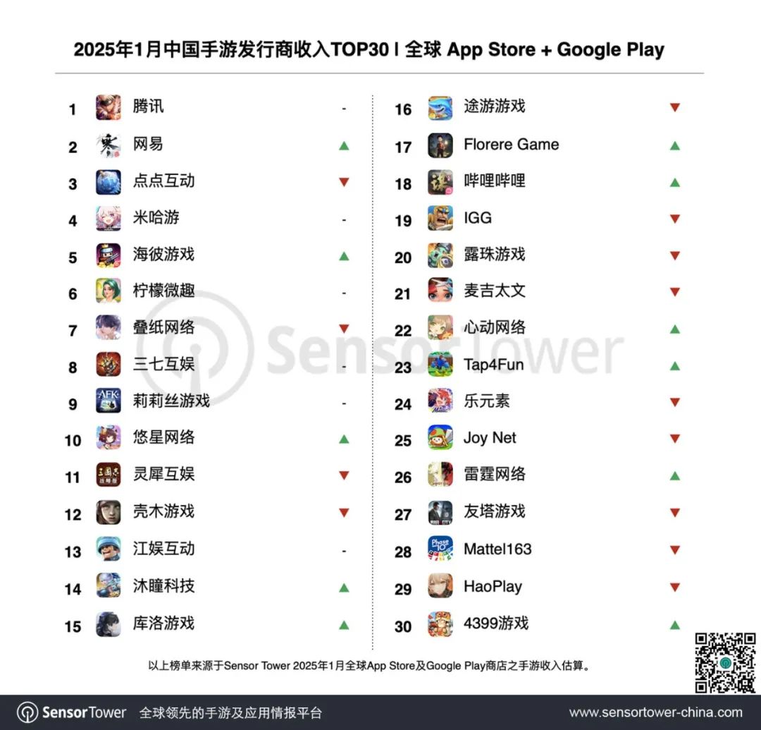 Sensor Tower:34家中国厂商入围1月全球手游发行商收入TOP100 吸金23.3亿美元