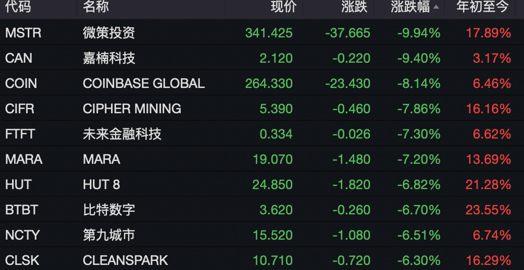 受到加密货币市场大跌影响,隔夜美股区块链概念股大幅走低。微策投资、嘉楠科技跌超9%,COINBASE GLOBAL跌超8%。