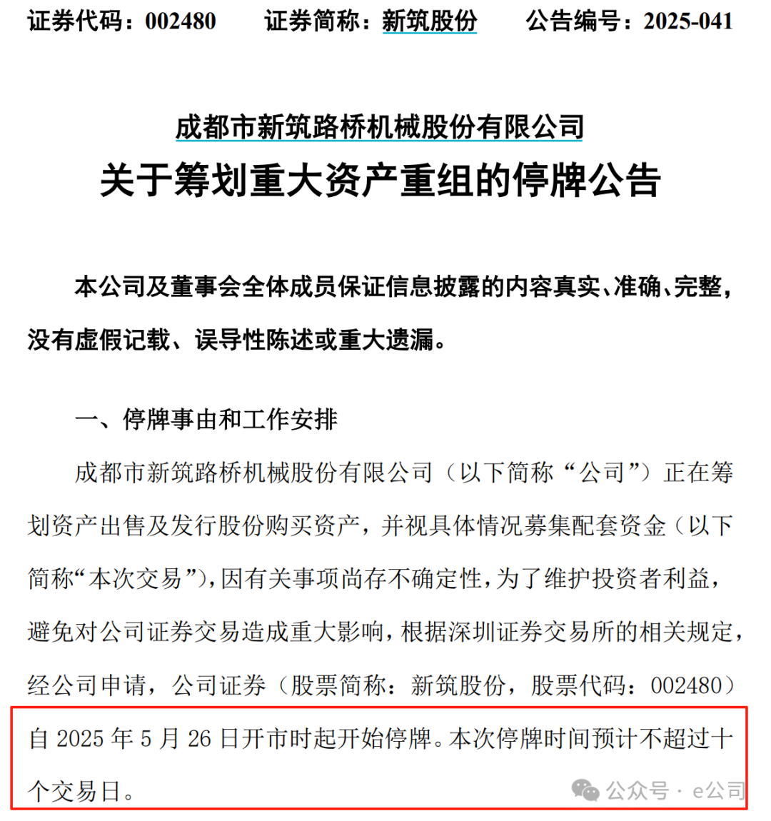 新筑股份(002480)5月26日午间宣布,公司正在筹划资产出售及发行股份购买资产,并视具体情况募集配套资金,因有关事项尚存不确定性,为了维护投资者利益,公司申请股票自5月26日开市时起开始停牌。本次停牌时间预计不超过十个交易日。