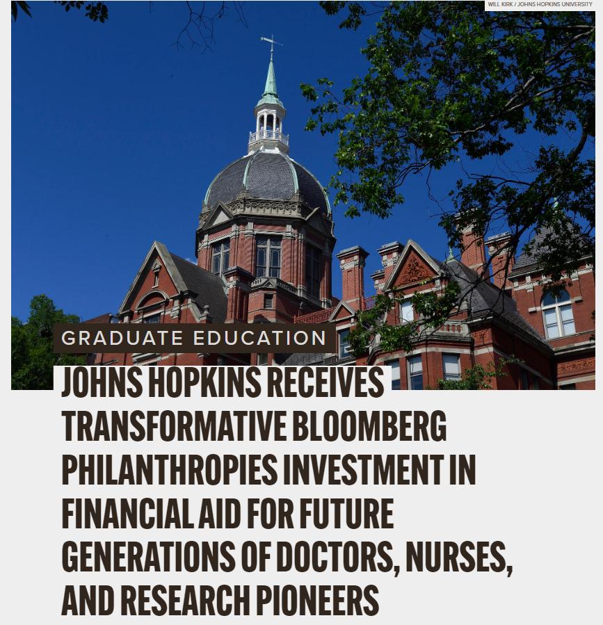 算上最新的这笔捐赠,彭博慈善基金会对约翰斯·霍普金斯大学的总捐赠额已经达到45.5亿美元,目前该校的公共卫生学院正以他的名字命名。