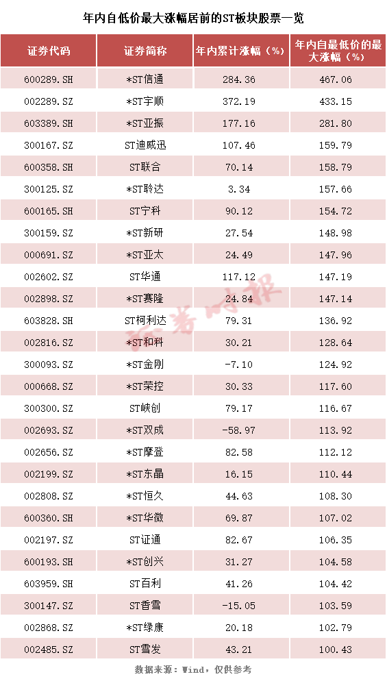 数据显示,包括*ST宇顺、*ST信通、*ST亚振、ST华通、ST迪威迅、ST宁科、ST证通、ST柯利达、ST峡创、ST亚联、ST广网、ST凯文、*ST佳沃、ST舜天、ST中利、*ST长方等在内的多只ST股年内累计涨幅超过50%,其中*ST宇顺、*ST信通、*ST亚振、ST华通、ST迪威迅等ST股年内累计涨幅超过100%。