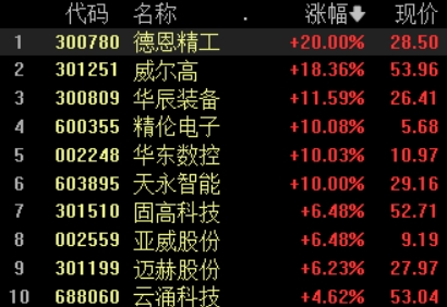 9月26日,新型工业化概念股强势领涨,德恩精工20%涨停,精伦电子5连板,天永智能2连扳,华东数控封涨停,板块内个股近全线飘红。