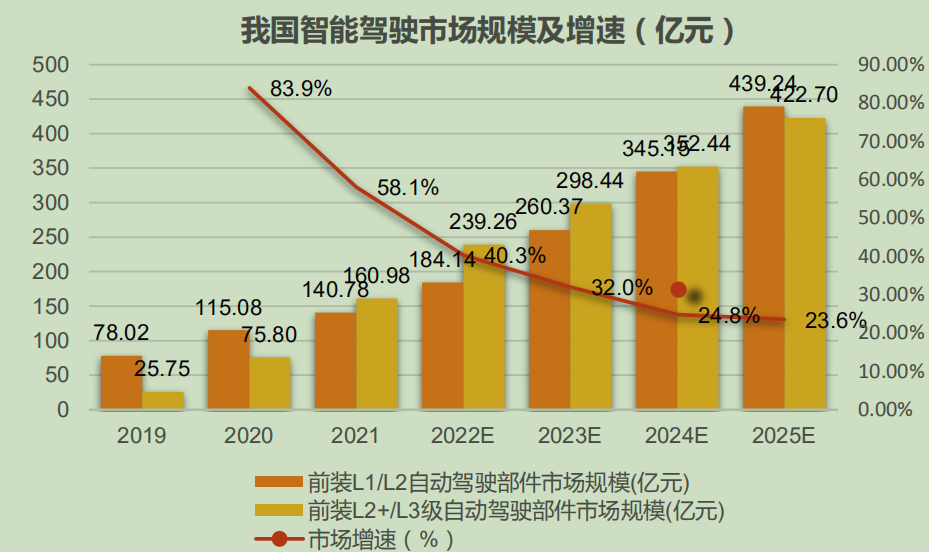 据天风证券预测,2025年L1/L2级智能驾驶的渗透率快速提升可达约60%,L2+/L3级渗透率达到约20%,L1-L3级智能驾驶渗透率合计可达80%。除去渗透率提升之外,智能驾驶系统的升级还可带来单车零部件价值量的快速提升,前装L1-L3级智能驾驶行业规模有望从2021年的302亿元增长至2025年的合计862亿元,CAGR可达30%,行业处于高速发展中。
