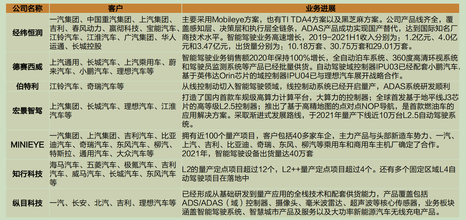 华西证券崔琰在2021年4月的研报中表示,感知硬件主要包括激光雷达、毫米波雷达、摄像头和超声波雷达。供应厂商有华为、览沃、禾赛科技、速腾聚创、光迅科技、沪电股份、雷科防务、紫光国微、德赛西威、华域汽车、海康威视、生益科技、舜宇光学、比亚迪、水晶光电、瑞声科技、联创电子、晟泰克、辅易航、行易道等。判断层厂商主要有德赛西威、百度、图森未来、四维图新、寒武纪、保隆科技、华为、地平线、黑芝麻、初速度、滴滴、文远知行、小马智行、赢彻科技、经纬恒润、福瑞泰克等。执行层方面有伯特利、耐世特、拓普集团、亚太股份、德尔股份、万安科技、联创汽车电子、同驭科技、拿森电子等。
