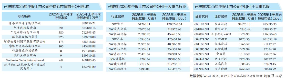 上市公司2025年中报正在密集披露当中,从前十大流通股东名单来看,QFII二季度明显加大对A股市场的配置力度。Wind数据显示,截至8月27日中国证券报记者发稿时,已有3290家A股上市公司披露了2025年中报,其中663家公司的前十大流通股东名单中出现了QFII的身影。具体来看,QFII在二季度新进成为374只个股的前十大流通股东;同时,对另外157只个股的持股数量相比一季度末有所增加。行业方面,QFII对电子行业持仓市值超120亿元,对有色金属行业持仓市值超50亿元。