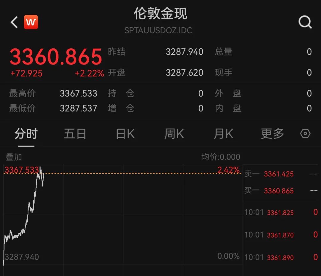 在连续回调后,周四早上,国际现货黄金直线拉升,现涨2.22%,站上3360美元/盎司关口。国内黄金期货合约也直线拉升。