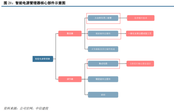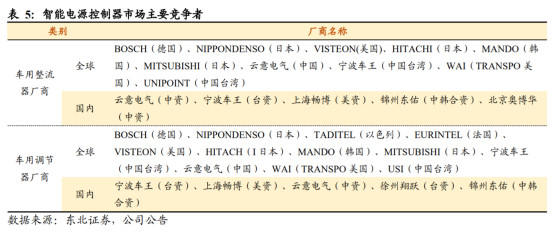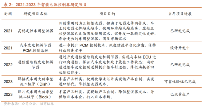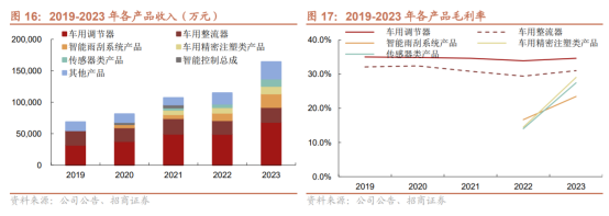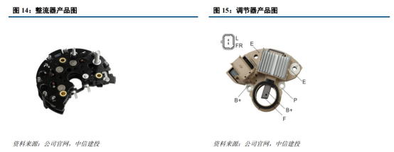 智能电源控制器销量稳定,保持行业龙头地位。智能电源控制器主要产品包括车用整流器和调节器等。车用整流器由大功率车用二极管、正负极板、精密嵌件注塑件及其它辅件组成。大功率车用二极管的核心零件是半导体芯片,其质量优劣是影响车用整流器使用寿命的重要因素;车用调节器包括集成电路、碳刷、精密嵌件注塑件等,集成电路由厚膜基板和各种规格精密电子元器件组成。车用整流器和调节器工作环境温度在-40~125℃,同时受振动、油汽、盐雾、酸雾、水气、污泥及电磁干扰等综合因素影响,产品使用环境非常苛刻,对调节器的线路布局技术要求较高。作为汽车发电机的关键零部件,车用整流器和调节器主要应用于汽车发动机、发电机系统中,确保电压输出稳定,确保整车供电及正常运行,同时通过运用半导体技术进行系统集成实现软启动、过载保护、与车载ECU通讯等多种功能,提高汽车使用过程中的安全性、环保性和舒适性,对汽车电子系统的使用寿命及汽车行驶的安全性、能耗排放以及舒适性具有重要影响。