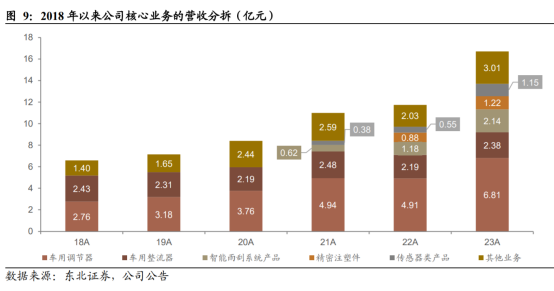 成长业务:智能雨刮系统(营收2.4亿元,占比11.3%,毛利率23.1%)、半导体功率器件(营收1.8亿元,占比8.3%)、传感器类产品(营收1.5亿元,占比6.8%)、微特电机控制器、新能源连接类产品(营收0.6亿元,占比2.6%)。
