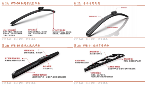 公司攻克雨刮产品核心技术,产品自制程度高。公司智能雨刮系统产品主要产品包含有骨雨刮、无骨雨刮、雨刮系统及相关控制单元、驱动装置等。掌握关键核心技术无骨正向压力分布设计算法、雨刮运动控制技术、NVH研究技术及基础材料研发技术,现已实现汽车雨刮CR胶条全流程国产化。自制化程度高,成本优势凸显,公司智能雨刮相关产品已进入比亚迪、上汽大众、长安汽车、奇瑞汽车、江淮汽车等车厂供应体系,适配多款畅销车型,并积极拓展与小米汽车、理想汽车、吉利集团等国内知名车企的业务合作机会,目前已向部分车厂以系统总成的方式供货。