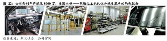 公司雨刮产品包含有骨雨刮、无骨雨刮、雨刮系统及相关控制单元、驱动装置等。现已掌握胶条橡胶材料配方自主研制、无骨算法设计及NVH设计与诊断技术,保证行车安全,提升驾乘感受。截止2023年2月,核心胶条全部自主研发生产,是国内唯一一家通过主机认证并批量装车的雨刷胶条,年配套量超1500余万根,有效解决目前市场常见的异响、刮不净、不耐用的胶条问题。公司应用先进的橡胶成型和切割技术,具备专业化的自动化烤漆线和冲压设备,拥有着自主开发和设计验证的能力,拥有完整的质量控制体系,包括APQP开发流程,ERP/PDM管理系统、先进先出可追溯管理系统。