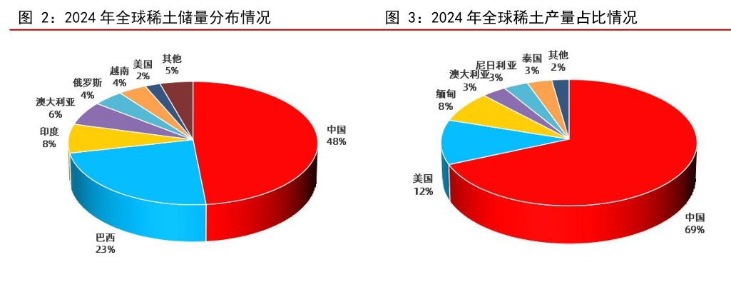 全球稀土资源分布集中度较高,中国储量世界第一占全球储量比约48%。根据自然资源部转引美国地质调查局(USGS)最新公布数据显示,2024年全球稀土资源总储量约为9088万吨,其中中国储量为4400万吨,占比约48%,巴西储量2100万吨,占比23%,印度储量690万吨,占比8%,澳大利亚储量570万吨,占比6%,前四大稀土资源持有国资源储量合计超过全球总储量的85%,资源分布集中度较高。
