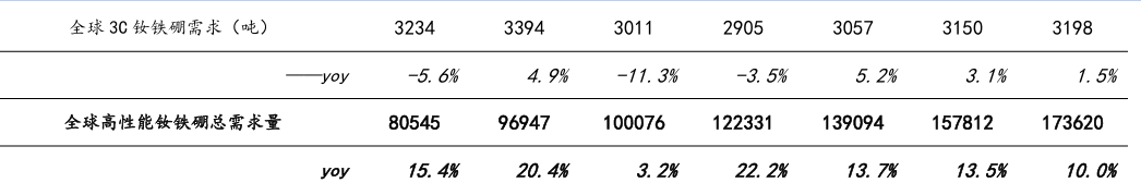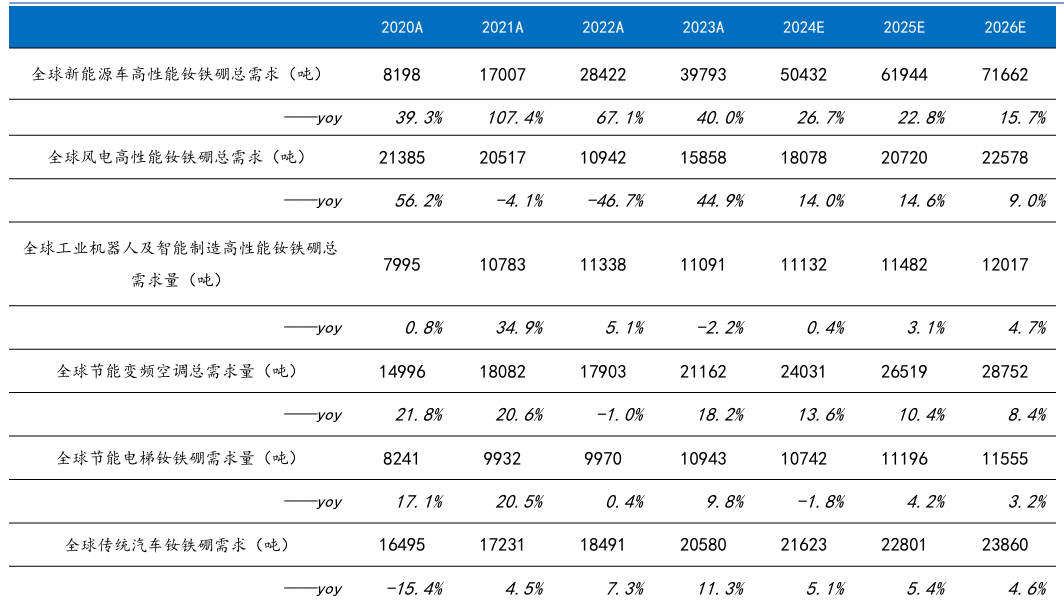 根据我们测算,到2026年全球高性能钕铁硼总需求将达到17.36万吨,24-26年CAGR为12%。2024-2026年新能源汽车需求贡献占比为36%/39%/41%,24-26年CAGR为19%,贡献需求端主要增量;人形机器人需求快速增长,我们预计27年销量有望达到10万台量级,若远期达100万台量级,届时高性能钕铁硼需求量增加至3500吨。
