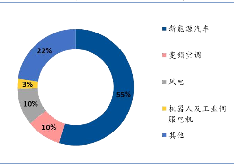 稀土下游,主要是钕铁硼材料。高性能钕铁硼永磁材料因效率更高被应用于新能源和节能环保领域,新能源车需求占比超55%。普通钕铁硼主要应用于磁吸附、磁选、电动自行车、箱包扣、门扣、玩具等领域。高性能钕铁硼是内禀矫顽力和最大磁能积之和大于60的烧结钕铁硼磁材,因其具有减小产品体积和重量的同时能够提供更高的使用效率的特点,被广泛应用于新能源和节能环保领域,包括风力发电、新能源汽车及汽车零部件、节能变频空调、节能电梯、机器人及智能制造等领域。
