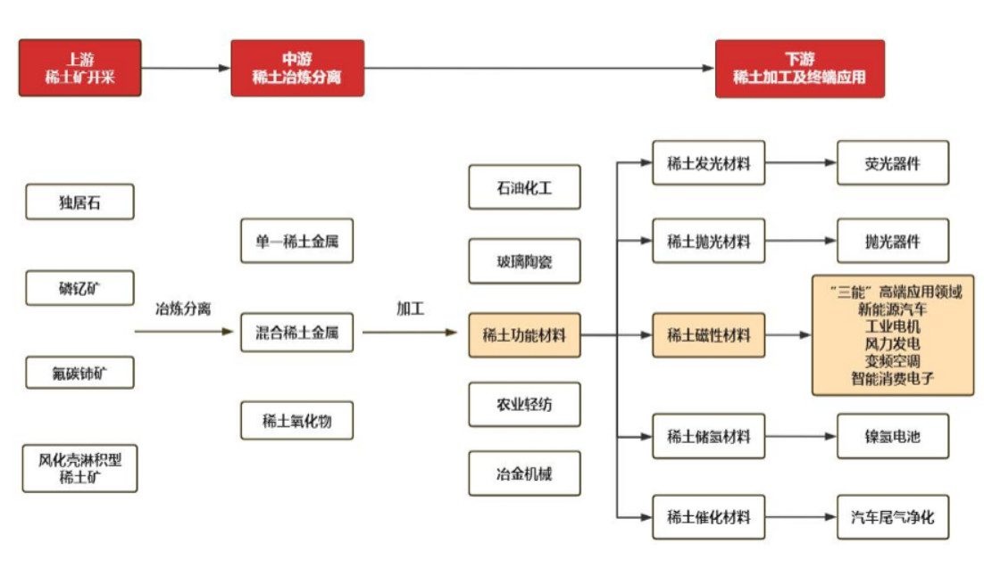 稀土的产业链模式较为稳定,一般包括5个上下游环节:开采选矿、冶炼分离、功能材料制备、终端应用、循环回收。其中,开采选矿和冶炼分离属于通常意义上的稀土上游原料供应环节;中游功能材料制备是对稀土原料的进一步制备形成稀土永磁、催化、储氢、抛光和发光等功能材料;下游应用于多种终端产品,应用领域包括航空航天、新能源汽车、风电设备、电子信息、石油化工、冶金等,循环回收则是从稀土生产废料或末端废料中回收稀土资源并进行循环再生利用。