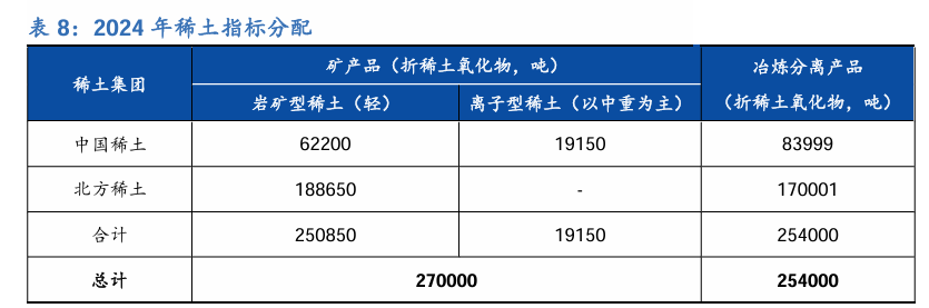 据工信部和自然资源部,以2023年数据来看,各大稀土集团的指标分配情况如下:轻稀土开采方面,北方稀土拥有17.9万吨,占轻稀土总指标的75%,其它均为中国稀土所有;中重稀土方面,中国稀土拥有1.3万吨,占总指标的约68%。轻稀土方面,北方稀土和中国稀土集团占据了全部开采指标;重稀土方面,2024年指标都给了中国稀土。北方稀土和中国稀土集团分别占75.2%和24.8%。从轻稀土开采总量指标看,2024年轻稀土开采总量指标合计25万吨REO,同比增长6.4%。分公司看,轻稀土开采指标仅分配给中国稀土集团和北方稀土,其中,中国稀土集团指标为6.22万吨REO,同比增长8.7%,占总指标24.8%;北方稀土指标18.87万吨REO,同比增长5.6%,占总指标75.2%。