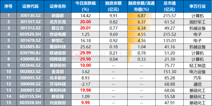 此外,在上述这些个股中,累计共有15股今日成交额创上市以来新高。其中,联迪信息、兴业股份、同辉信息、北方长龙、智立方、泰和科技、英联股份7股今日涨停,占整个“历史天量成交股”近一半比例。值得注意的是,兴业股份、英联股份已分别晋级5连板、4连板。融资控盘比方面,新国都、北方长龙、智立方获融资客重仓,融资余额较流通市值比均在6%以上。