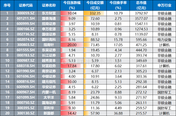 今日,市场整体活跃度大幅提升,截至收盘,沪、深、京三市全天成交额16395亿元,较昨日放量近1914亿元,同时创4月10日以来近2个月新高。个股层面来看,累计共有109股今日成交额录得年内新高,其中,千亿市值股共有5只,分别为东方财富、国泰海通、招商证券、申万宏源、国信证券,同时,国轩高科、指南针、东吴证券等大盘股也在列。