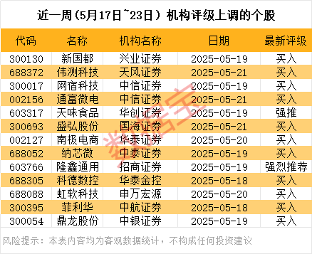 从评级调整来看,有13股获机构调高评级,包括网宿科技、通富微电、天味食品、盛弘股份等。