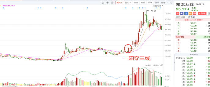 这根一举上穿三条均线的放量长阳K线称之为“一阳穿三线”。