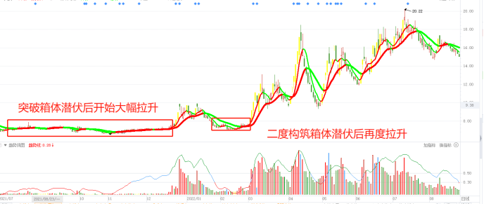 通常潜伏底的时间比较长,但是,其突破后产生的成交量激增和股价的暴涨也是惊人的,一般底部出现首板涨停可开始重点关注。