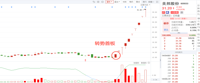 这是美邦股份在2025年1月2日出现低位首板转势,前期该股持续调整,大盘和微盘股调整较大,但是该股在此走出转势信号,这期间也是市场新老周期交替之际,老龙头断板。