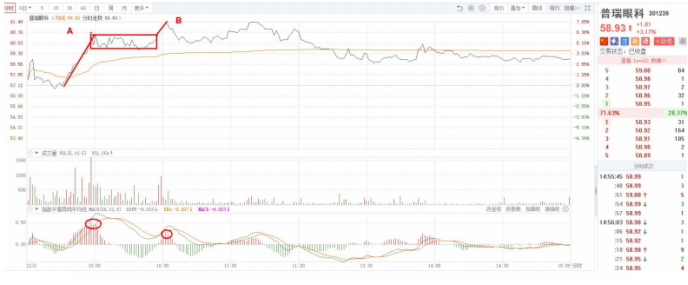 图例:普瑞眼科在2024年12月2日走势图,形成两段拉升走势,但是第二段拉升价格创新高,但是其 MACD 指标红柱体反而较第一波有明显萎缩,说明其上攻动能 减弱,这种走势在走新高的过程种构成分时图顶背离,我们也往往是作为减仓时机。
