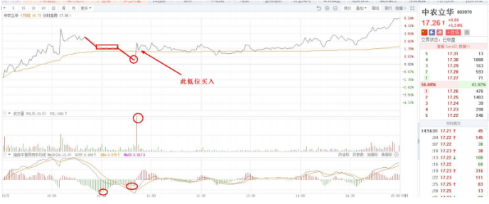 图例:上图是中农立华在2024年12月2日出现回落,但是回落过程中,走势出现我们的模型,另外下方可以看到MACD指标绿柱体逐步缩短,所以在次低位买入,然后再拉升过程中卖出增加的数量,保持总仓位不变,当日做T其空间也是不小
