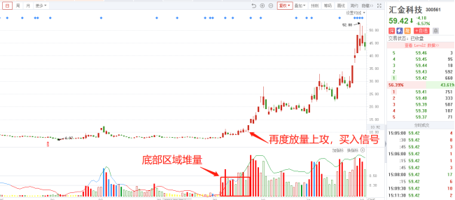 图例:汇金科技从2023年9月份开始持续调整至2024年9月,调整周期长达一年,但是从9月6日开始,该股处于底部区域,连续多日成交量明显放大,呈现底部堆量结构,后期再度放量上攻,借助放量上攻时关注,后期涨幅超过400%。